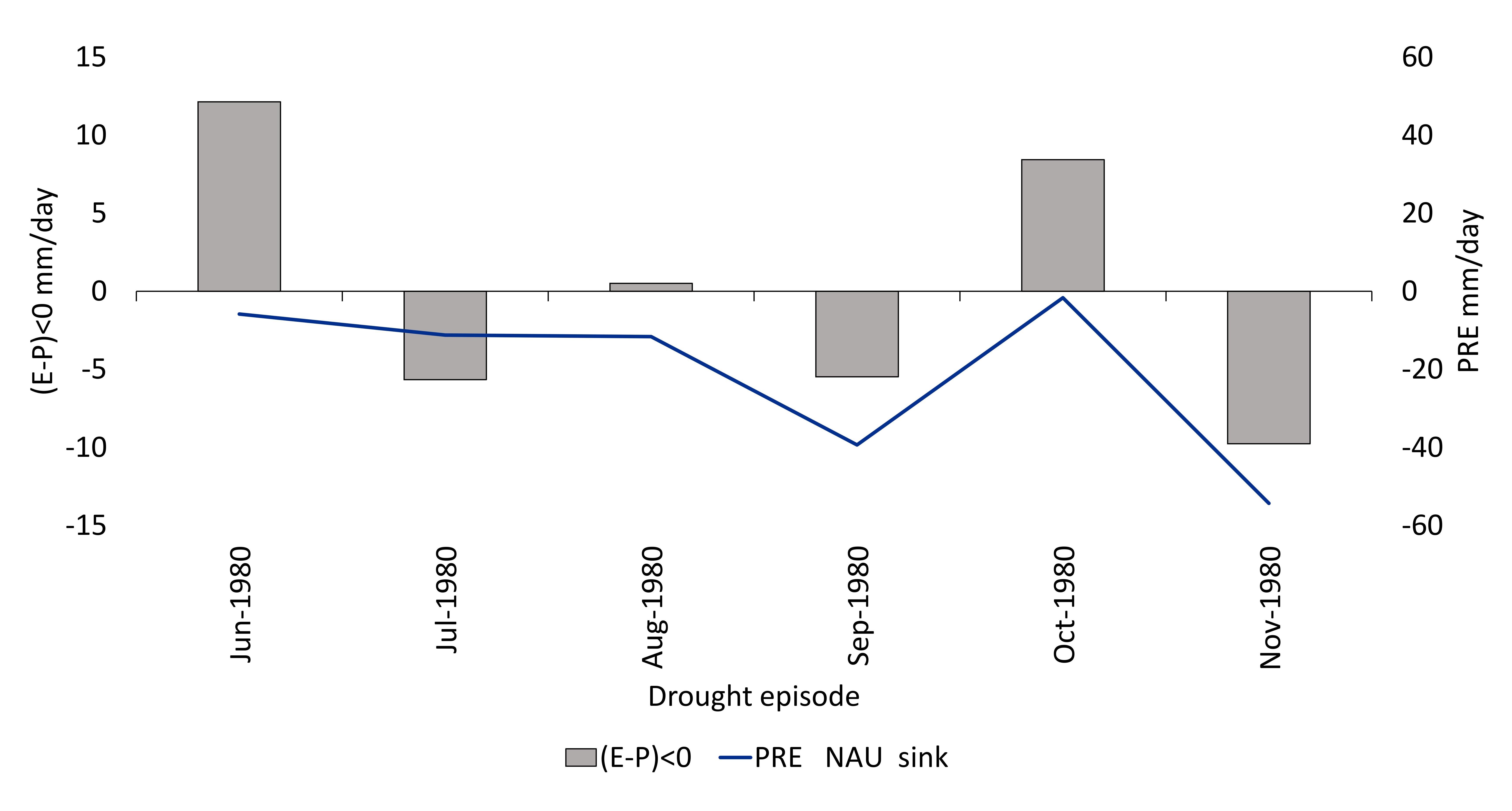 Anomalies of the Lagrangian Analysis Components for the Most Severe Drought Episode over NAU  identified through SPEI-1 during 1980-2015