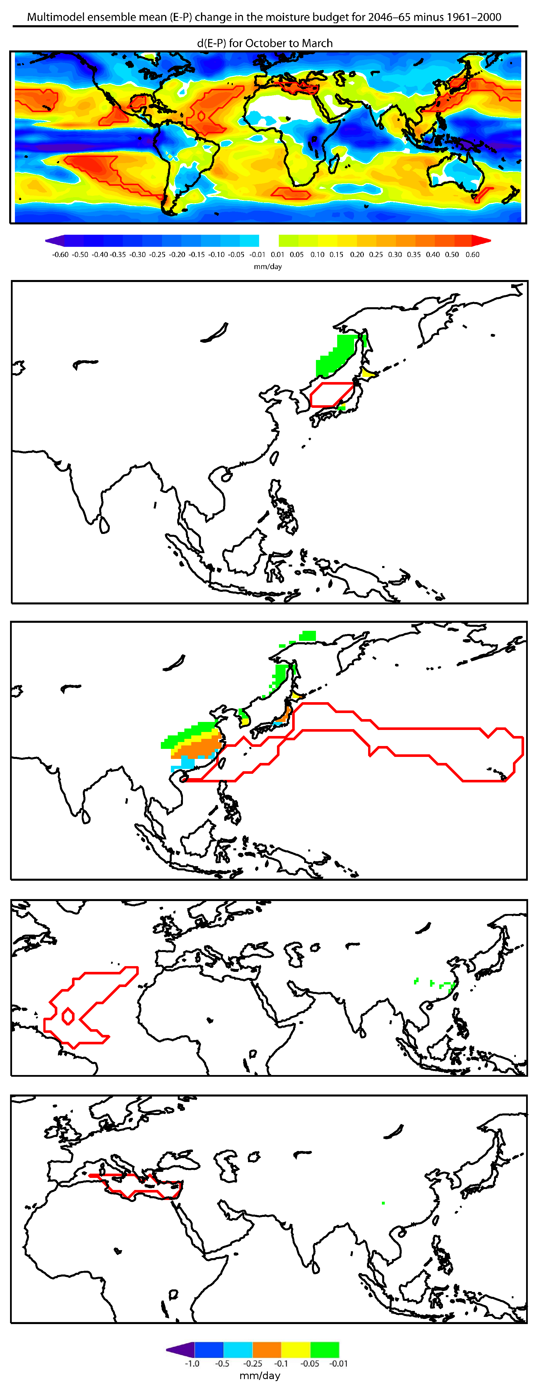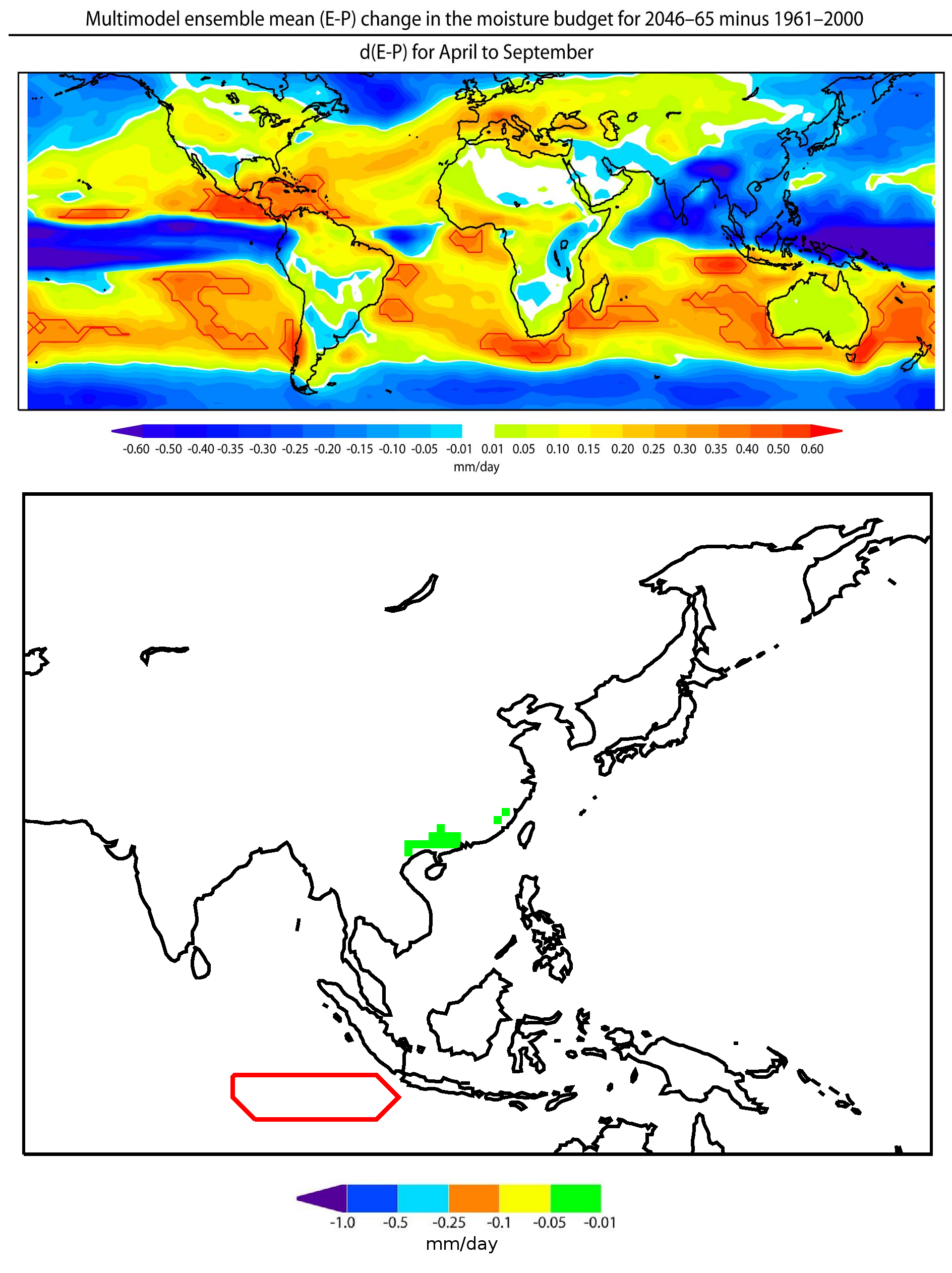 (top) Multimodel ensemble mean (E-P) change in moisture budget for 2046-1965 minus that for 1961-2000. Data provided by Richard Seager [Seager et al., 2010].