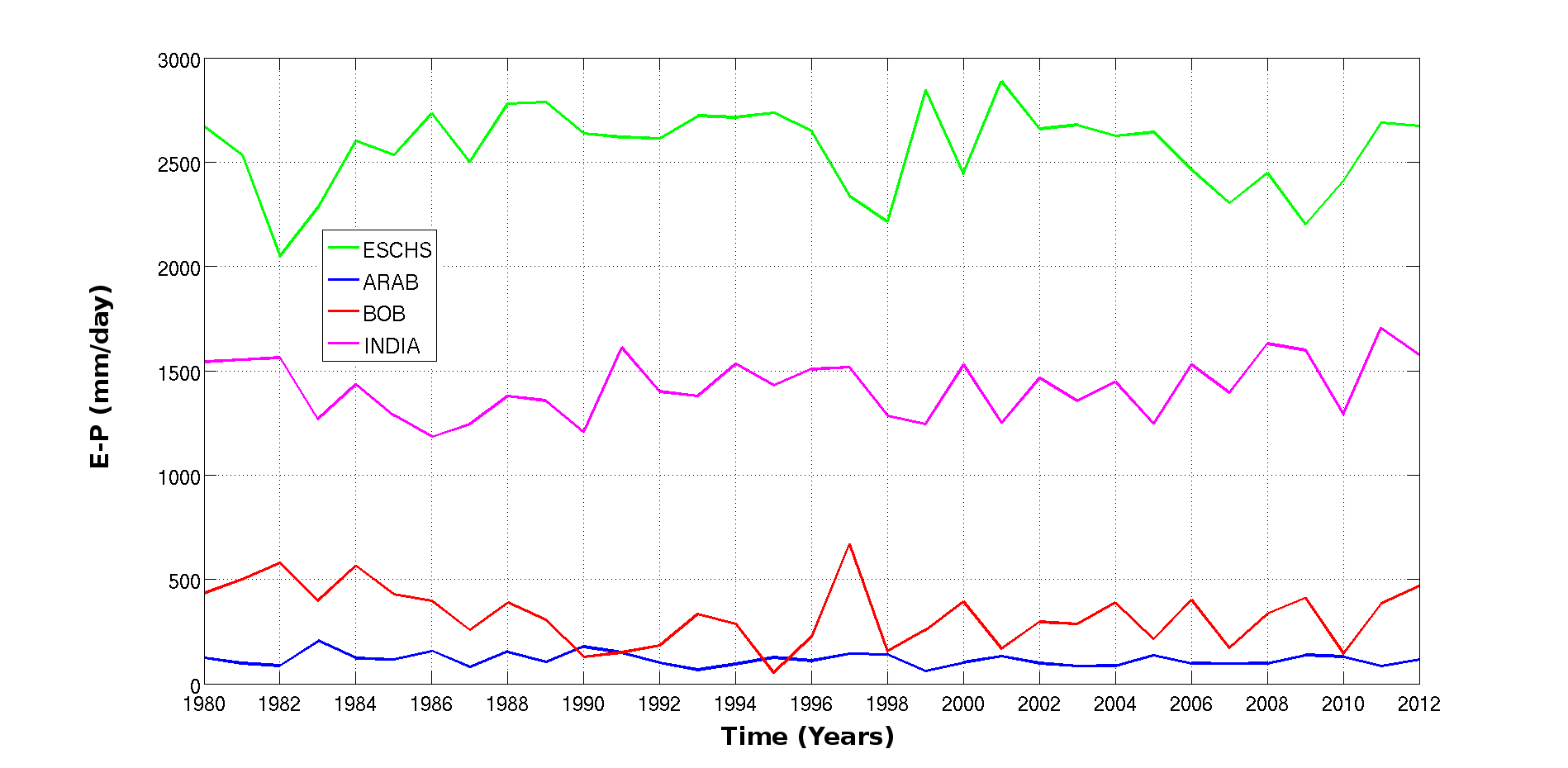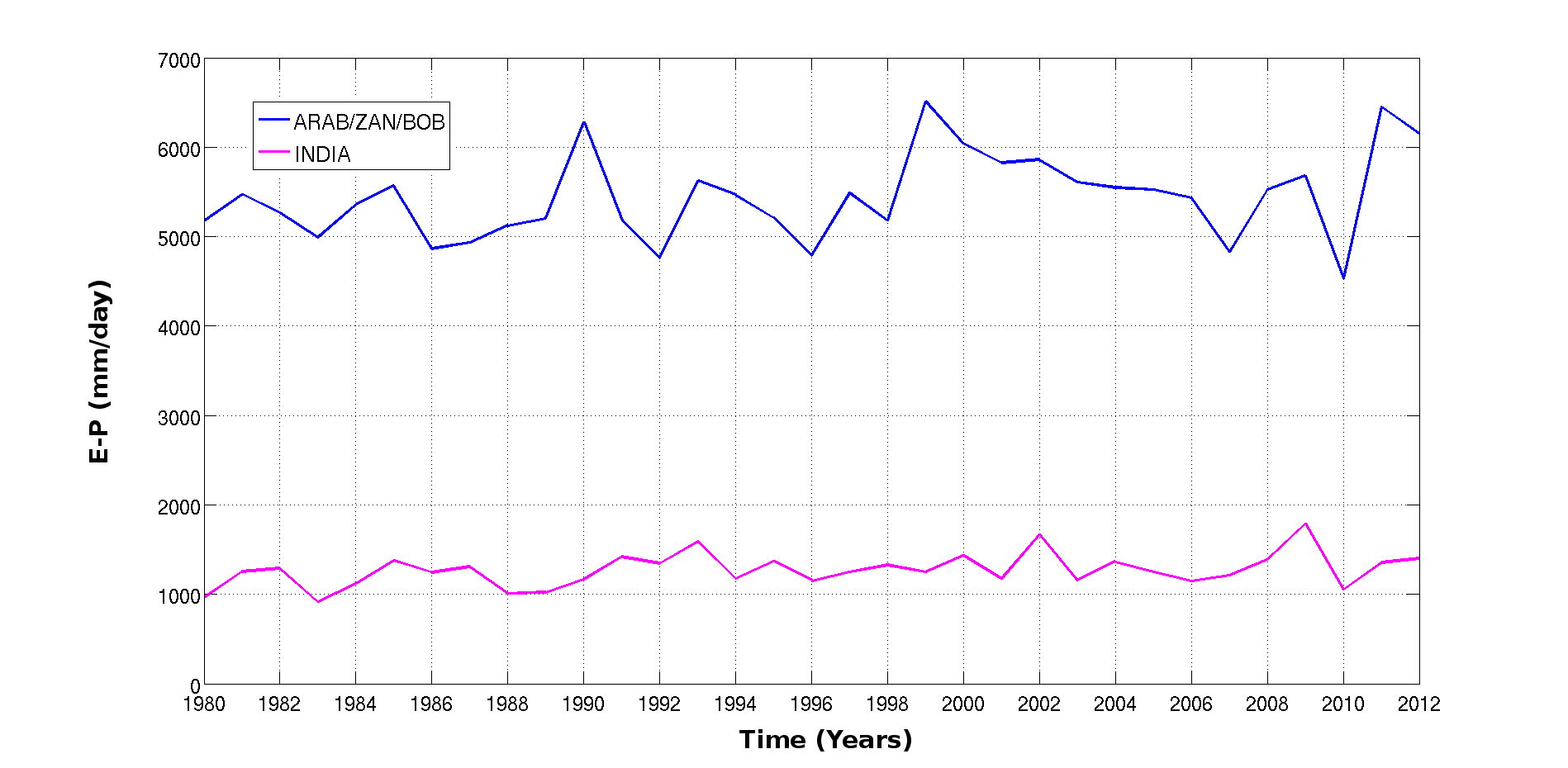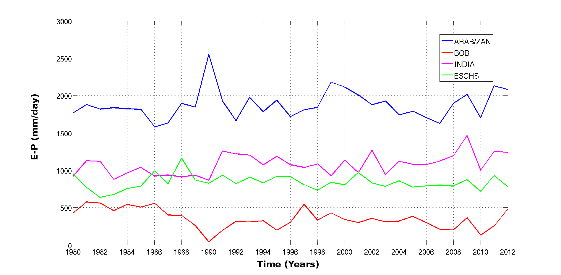 Averaged annual values of (E-P)1-10 values for the SA CCR associated with its moisture sources: Arabian Sea and Zanzibar Current (blue line, ARAB/ZAN), Bay of Bengal (red line, BOB), India (magenta line, INDIA) and East and South China Sea (green line, ESCHS).