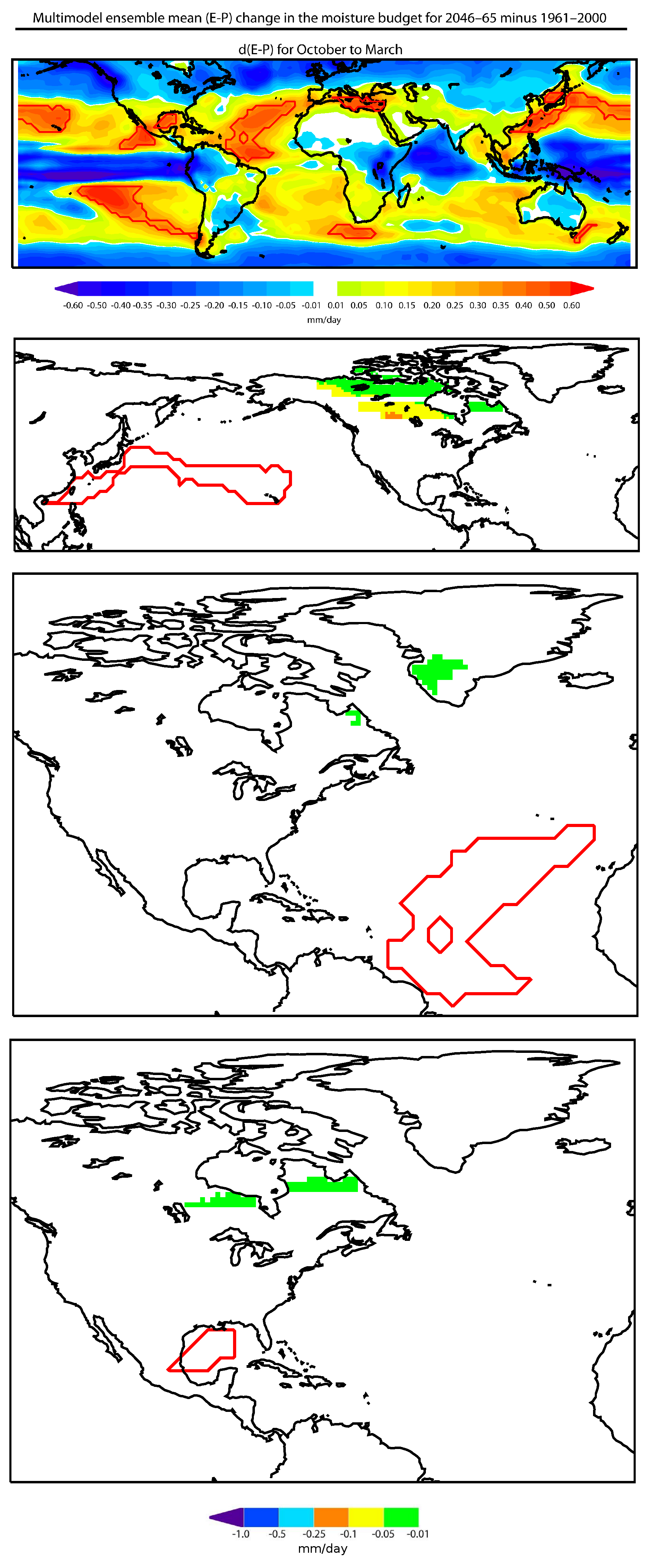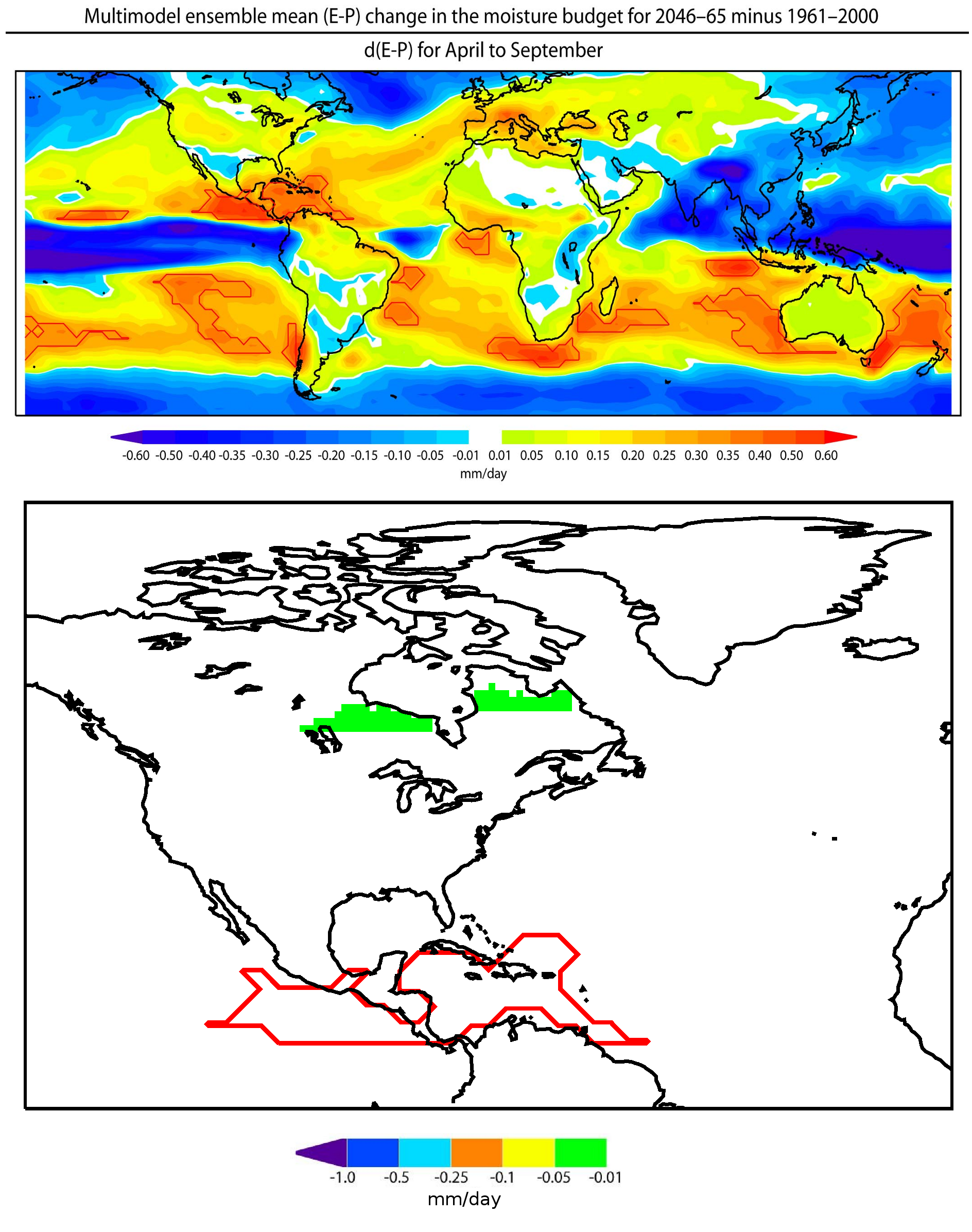 (top) Multimodel ensemble mean (E-P) change in moisture budget for 2046-1965 minus that for 1961-2000. Data provided by Richard Seager [Seager et al., 2010].